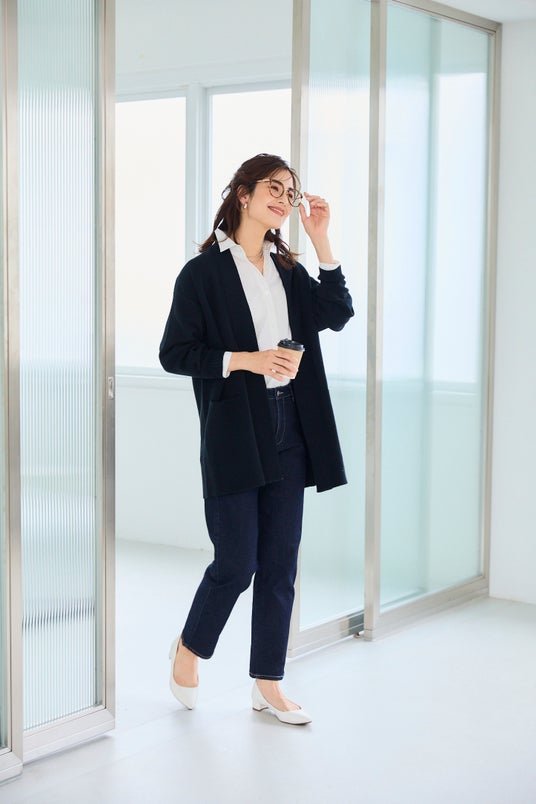 なかなか本格的に寒くならない今年の冬、特に活躍する羽織り物といえばコーディガン。お尻をすっぽり覆う丈感とストンと落ちるシルエットが、縦のラインを美しく見せてくれます。中に着たシャツの襟を立てて、首回りでも縦ラインを強調したのがポイント。