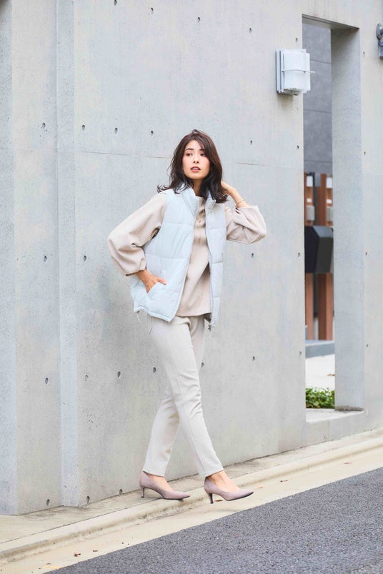 ボリュームのあるダウンベストは軽くて撥水・防風機能もついた実力派。ウールライクの温かみのあるトップスと細めボトムのシンプルなワントーンコーデに、ベストがシルエットでメリハリを出してくれ、マンネリ打破&スタイルアップが叶います。