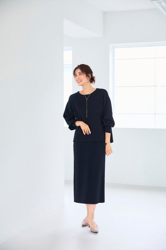 洗濯機で洗えてタンブル乾燥もできる、マシュマロのようにふんわりやわらかな風合いのニットトップス。同素材のスカートとセットアップで着用することで、同素材の統一感から縦のラインが強調され、シンプルながら洗練されたコーデに。
