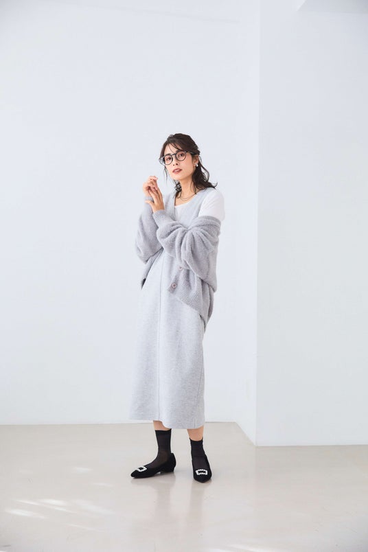 ストンと落ちるシルエットと深めのVネックで縦ラインを強調してくれるジャンスカは、スタイルアップの強い味方。同系色のグレーのカーデをラフに羽織れば、上半身に視線が集まってさらにGOOD。
