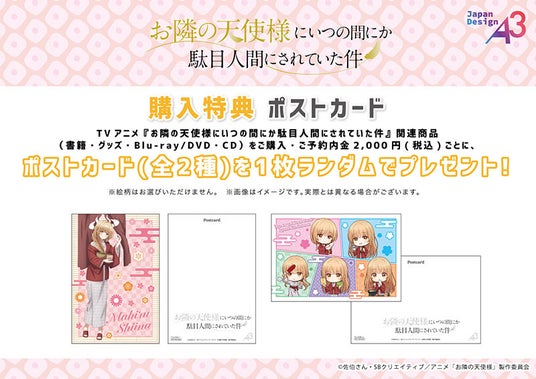 期間中に会場内にてTVアニメ「お隣の天使様にいつの間にか駄目人間にされていた件」関連商品(書籍・グッズ・Blu-ray/DVD・CD)をご購入・ご予約内金2,000円(税込)ごとに、特典ポストカード(全2種)をランダムで1枚プレゼント!