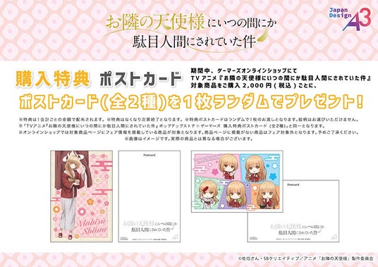 期間中、ゲーマーズオンラインショップにてTVアニメ「お隣の天使様にいつの間にか駄目人間にされていた件」対象商品をご購入2,000円(税込)ごとに、特典ポストカード(全2種)をランダムで1枚プレゼント!