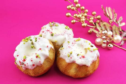 フルーツを練り込んだクグロフ生地を焼き上げ、ホワイトチョコ、ピスタチオ、ラズベリーの顆粒をトッピングしました。降り積もった雪を思わせる可愛らしい見た目に、フルーツの風味がホリデーを鮮やかに彩ります。