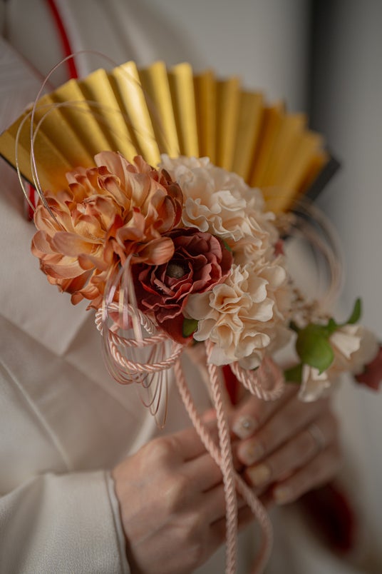 扇ブーケの扇形のデザインは、正面からの写真撮影はもちろん、斜めからの角度でも美しく映えます。和装でのポーズに合わせやすく、特に着物を着た際の立ち姿を一層引き立てます。