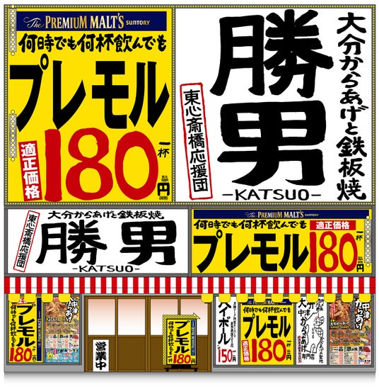 昨今、勝男の看板である「プレモル一杯180円」を模倣する形で、生ビールを一杯「180円」、「190円」等を看板メニューにする居酒屋が増えておりますが、勝男は14年前の一号店のオープン時から生ビール一杯「180円」という看板を掲げており第一人者を自負しております。