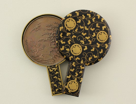 黒漆塗丸に揚羽蝶紋散柄鏡(※鏡の模様が蓬莱)