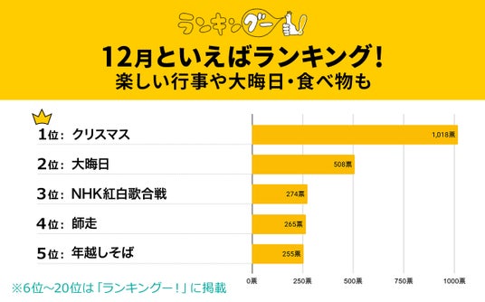 株式会社CMサイト(本社:大阪府大阪市、代表取締役社長:柴原 誠治)が企画編集する、「ちょっと気になる」を調べたランキングサイト『ランキングー!(https://rankingoo.net/)』は、『12月といえばランキング!楽しい行事や大晦日・食べ物も』の結果を、投票者のコメント付きで紹介する記事として公開しました。