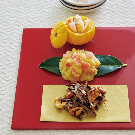 上からかぶときんかんのなます、りんごきんとん、ナッツ田作り