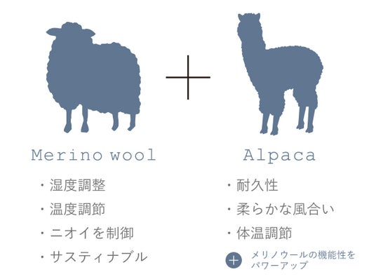 メリノウールの持つ湿度と温度の調整機能、防臭効果、そして柔らかさを取り入れて、それを高めるのがアルパカです。アルパカを糸にブレンドすると、メリノウールの自然な利点が次のレベルの快適さへパワーアップ。