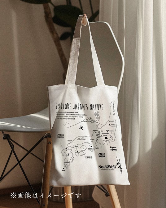 日本百名山と景勝地から着圧ソックスで訪れてほしいスポット、アルペンPOPUP開催店舗を地図にしたA4サイズのコットントート。アクティブシーンで役立つソックウェルの特徴もデザインの中に。