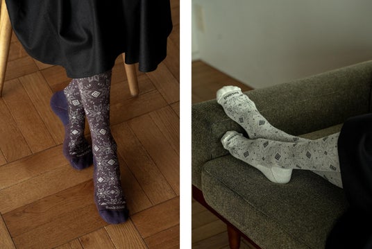 足首にぐるっと山の風景が描かれた、アウトドアウェアにも映えるデザイン。クルー丈の中にも着圧機能を施しています。厚めのクッションが長時間の歩行による衝撃を和らげて足元の疲れをサポート。ウール×アルパカ混紡で保温性も抜群です。