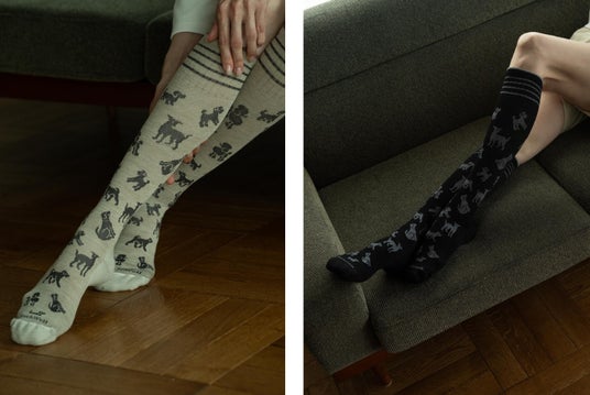 様々な犬種のシルエットがデザインされた犬好きさんにはたまらない一足。ファッションのポイントにもなる柄です。メリノウール×バンブーブレンドの肌触りの良い素材感に、Sockwell独自の段階着圧機能で一日中快適な足元に。