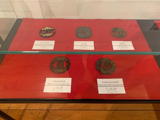 目貫(めぬき)や鐔(つば)など彫金・漆芸(しつげい)・象嵌(ぞうがん)・木工技術が投じられた刀剣を携帯する為の外装である刀装具を展示。