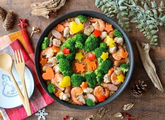 あめ色タマネギのコクと甘味を活かしたパエリアは、野菜や海鮮具材との相性が抜群。華やかな見た目で、クリスマスディナーにぴったりです。大人からお子様まで幅広く楽しめます。