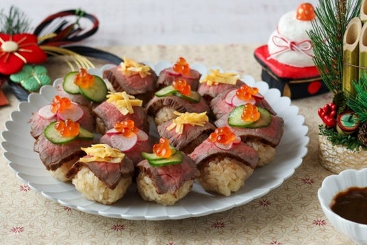 酢飯の代わりに、オニオングラタンスープを染み込ませたライスを使用。風味豊かな手まり寿司は、クリスマスやお正月のオードブルに最適。見た目もおしゃれで、特別な日にぴったりです。
