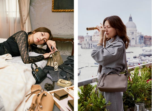 フェンディ 2024年ウィンターホリデーコレクションより、「FF」ロゴモチーフを織り込んだライトブルーのニットに、グレーのマイクロチェックパターンをあしらったクロップ丈のボンバージャケットとパンツのセットアップ、フェンディ メンズコレクションよりチェーンブレスレットを合わせたスタイリッシュな最新ルックに身を包み、ダヴカラーの「バイ ザ ウェイ セレリア(By The Way Selleria)」を手に、美しいヴェネチアの街を堪能する姿が描かれています。さらに、ホテルの部屋では、「FF」ロゴモチーフをあしらったブラックのボディスーツに新作のパールのネックレスや「オーロック(O’Lock)」モチーフのチェーンネックレス、タバコカラーのヘアクリップを合わせた華やかなホリデースタイルを披露。「ピーカブー アイシーユー プチ(Peekaboo ISeeU Petite)」や、「ナノ ピーカブー(Nano Peekaboo)」、「バイ ザ ウェイ セレリア」などアイコンバッグをはじめ、ジュエリーやフレグランスなどホリデーシーズンにぴったりのアイテムの数々に囲まれ、特別な時間を過ごすシーンも収められています。