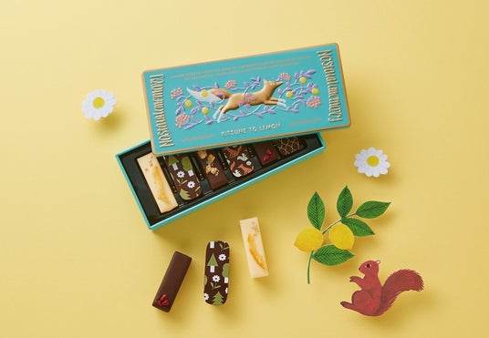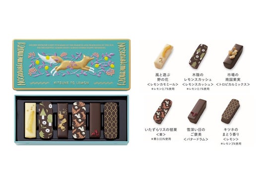 留め金付きのおしゃれなボックスに、「キツネとレモン」のオリジナルチョコレートを