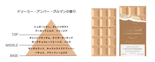 今回もデザインはチョコレートバーをイメージ。キャラメルチョコレートバーを表現したキャッチーでSWEETなデザインは、インテリアの一部にもなります。ぜひ、サブリナ・カーペンターがプロデュースしたグルマン香水をお楽しみください。