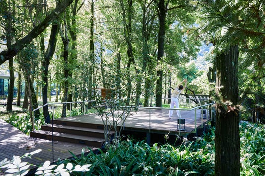 朝の木漏れ日が差し込むテラスで、「気循森呼吸」というストレッチとエクササイズを組み合わせたアクティビティを体験できます。これは気功の呼吸法とストレッチを組み合わせ、自然の「気」を体内に取り入れるものです。ウォーターガーデンを背景に、朝の爽やかな風と水音に包まれながら深呼吸を行い、新鮮な空気を全身に巡らせて、新しい一日を元気に始めることができます。
