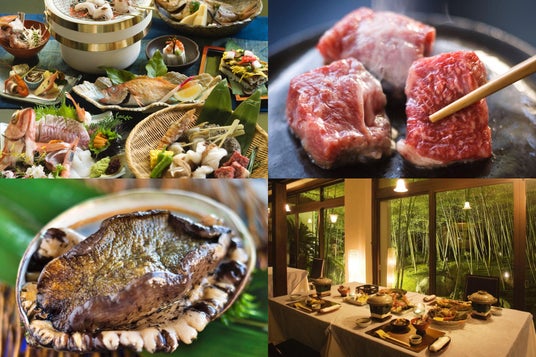お食事は、お米・お野菜などの有機栽培の食材と、丹後の地魚など季節の旬のお料理をご用意しております。 ご夕食・ご朝食は、本館ダイニングにて中庭の竹林庭園を眺めながら、お食事をお楽しみいただけます。
