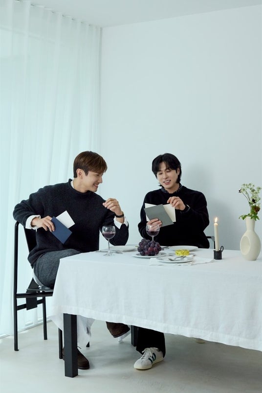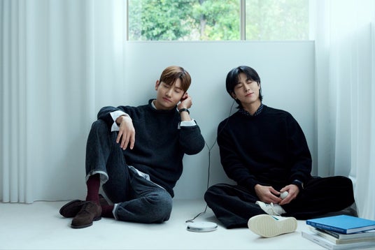 デビュー20周年を迎える東方神起のチャンミンさん(写真:左)とユンホさん(写真:右)の撮影は、「2人だけのアニバーサリー」というコンセプトで。自身のこれまでの楽曲を聴く2人。撮影:上澤友香