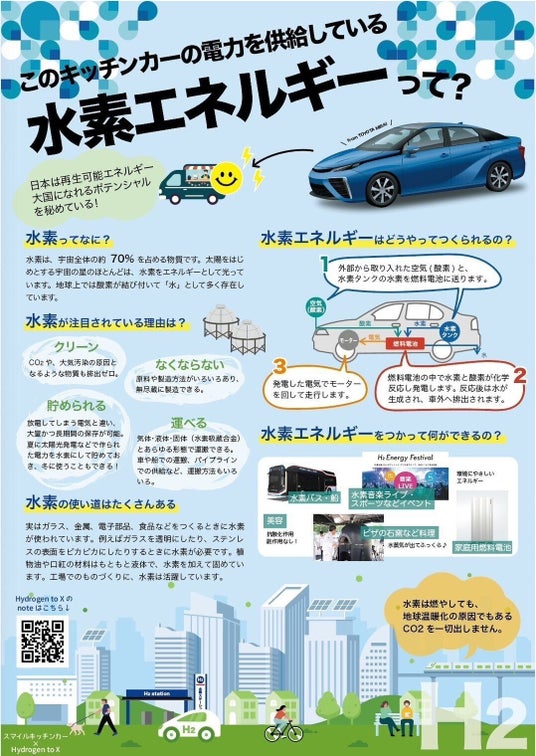 【食】を通じて人に笑顔を届けたいという「スマイルキッチンカー(株式会社Treasure)」と水素エネルギーで日本の未来を作りたいという「NPO法人 Hydrogen to X」がコラボし、水素自動車(燃料電池自動車(FCV))からキッチンカーへ電力を供給し調理します。
