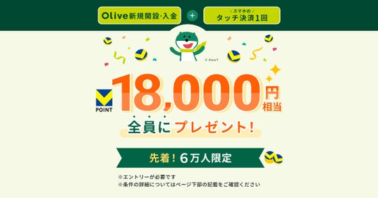 先着6万名さま限定 Olive新規開設+10万円入金で15,000円相当もらえる!キャンペーン+スマホタッチ決済“1回”で3,000円相当もらえるお得なVポイントPayギフトも