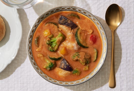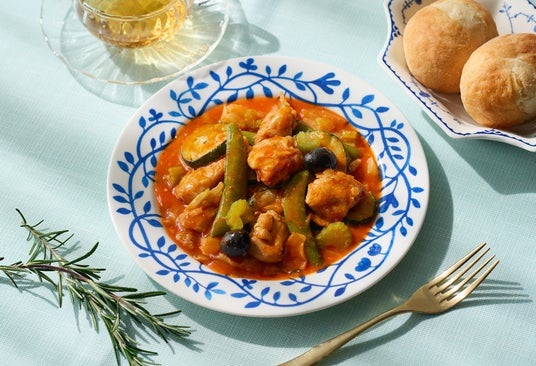 イタリアで広く親しまれている郷土料理「カチャトーラ」をヒントに、ふっくらジューシーな鶏もも肉と、ズッキーニ、スナップエンドウ、ブラックオリーブなどの具材を、オレガノとガーリックが香る完熟トマトソースで仕上げました。