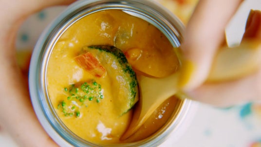 オフィスでのランチタイム、スープジャーを取り出す女性。中に入っているのは、GREEN SPOONの野菜スープ「King’s Brunch 温野菜たっぷり濃厚トマトのビスクポタージュ」です。ズッキーニやパプリカ、なすなどのゴロゴロ野菜が入ったあたたかいスープを、オフィスでもヘルシーで満足感たっぷりのランチとして味わう姿を描いています。