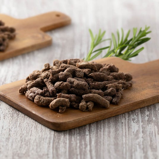 鹿の赤身肉を粗びきし、フリーズドライに仕上げました。そのままはもちろん、少量の水で戻して与えたり、おやつや毎日のごはんのトッピングとしても最適です。試作品の試食時にわんちゃん猫ちゃん共に最も人気の高かった商品です。
