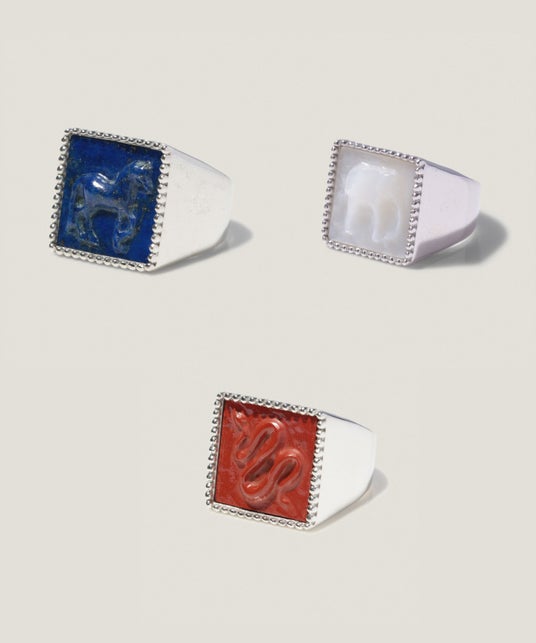 スクエア リングスクエアのシルバーに、邪気を払うと言われるラピスラズリ(ブルー)、女性らしさの象徴のマザーオブパール(ホワイト)、心の安定をもたらすレッドジャスパー(レッド)にそれぞれ別の動物モチーフを彫りました。指にあるだけでお守りのようなリングです。