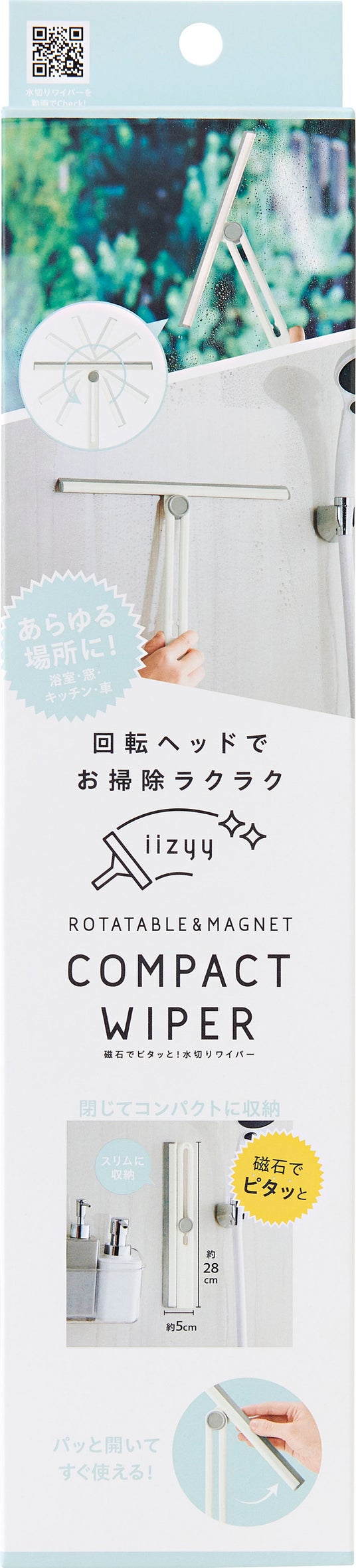 折りたたんでスリムに収納できるマグネット付きの水切りワイパー。ヘッド部分は操作性の良い回転式。