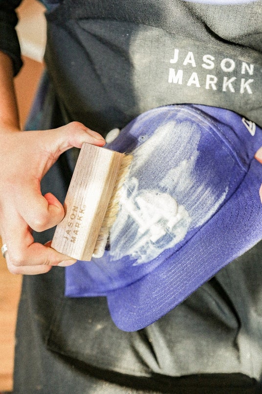 泡をブラシに直接付けてブラッシングし、クロスで拭きあげて使う帽子用のクリーニングキット。