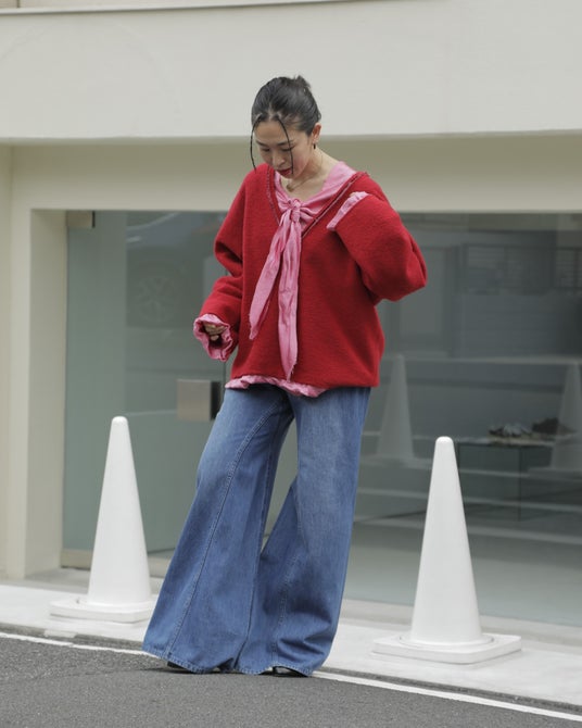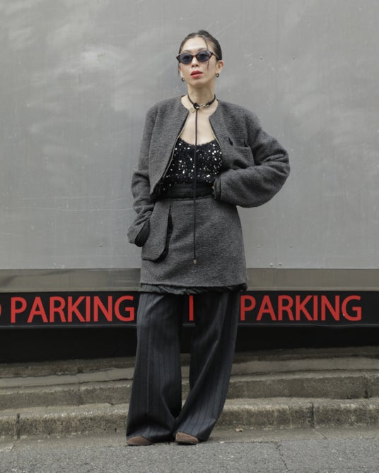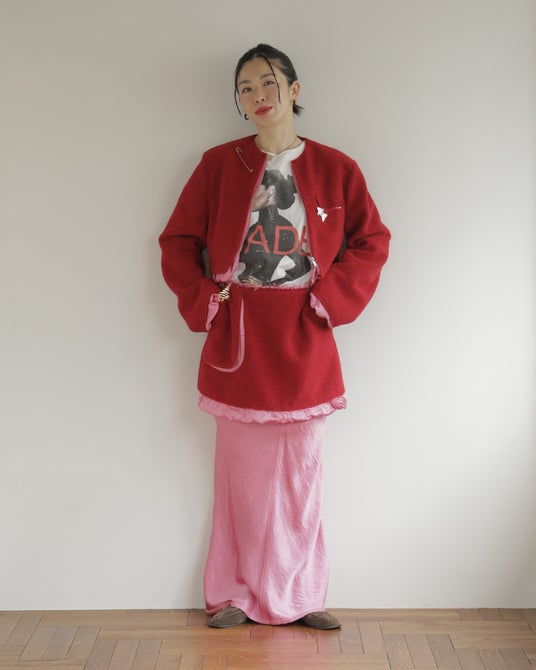 コンパクトなサイジング、フェミニン×グランジ、そこにリラックスした雰囲気をまとうスタイリングが気分だという長尾さんのセンスが光るバランスが、他にはないデザインに。