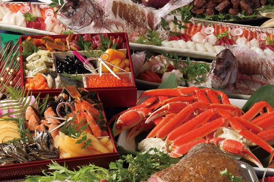 新春の喜びを込めたおせち料理や和前菜の取り合わせをはじめ、焼き蟹や寿司盛り合わせなど、新年のお祝いにふさわしい品々をご用意いたしました。洋食メニューは、スペイン産生ハムとコールミートの盛り合わせ、赤魚のオーブン焼きをジェノベーゼソースで味わう一品、根菜を添えた豚肉のフリカッセ、香味野菜入り若鶏のポトフなどをお楽しみいただけます。