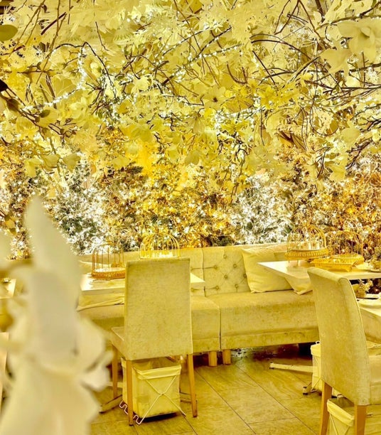 夜にはイルミネーションタイムもあります。お店全体がゴールドに輝く雪景色の世界でディナーをどうぞ。
