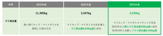 2022年、世界初となる “ゴミを出さないマラソン大会”を目指して大幅リニューアルしてから今年で3年目となる本大会。それまでは給水において約50万個の紙コップ・プラカップを使い捨て、約31,500本のペットボトルを使用し、ゴミの総量は11,495kgでしたが、昨年はゴミの総量が3,049kgとなり、8,048kg削減に成功。