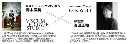 全体アートディレクション並びにボタニカル装飾の制作は、『人+植物+環境』をテーマに視覚・嗅覚・触覚という人間の感覚に着目し、新たな視点を提唱する「VISCUM FLOWER STUDIO」の代表・岡本俊英氏、香りは、健やかで美しい皮膚を保つためのスキンケアライフスタイルを提案する敏感肌向けスキンケアブランド「OSAJI(オサジ)」の創立者である茂田正和氏が監修しています。この2名の強力タッグにより生み出された、植物と香りそして光が織りなす深呼吸したくなる幻想的な空間、ここでしか体験できない心が整う癒しのひとときをお楽しみください。