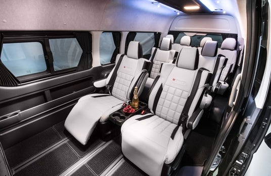 『EL RENTAL CAR(エルレンタカー)』は、ハイエースのカスタムを得意とする株式会社ジェイクラブが展開するレンタカーサービスです。トヨタ車体が制作しているビジネス送迎車、ハイエース「ファインテックツアラー」で、2~3列目のシートには高級車などで使われているオットマン付きのキャプテンシートを採用されており、車内高も153cmと広々とした快適空間が魅力です。さらに10人まで乗車可能なので大人数での移動がとても楽に行えます。