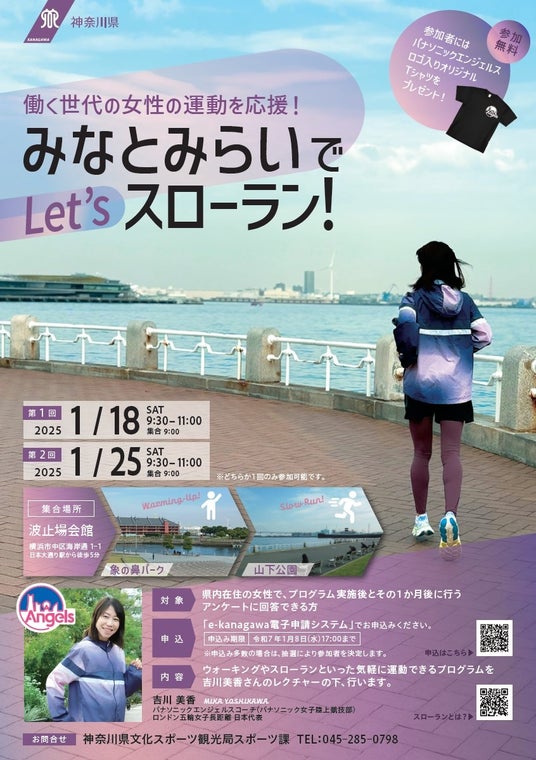 パナソニックエンジェルスの吉川美香コーチのレクチャーの下、象の鼻パークや山下公園で、ウォーキングやスローランといった気軽に運動できるプログラムを実施します。普段、運動の機会が少ない方や、これから運動したいと考えている方でも気軽に参加することができる内容です。