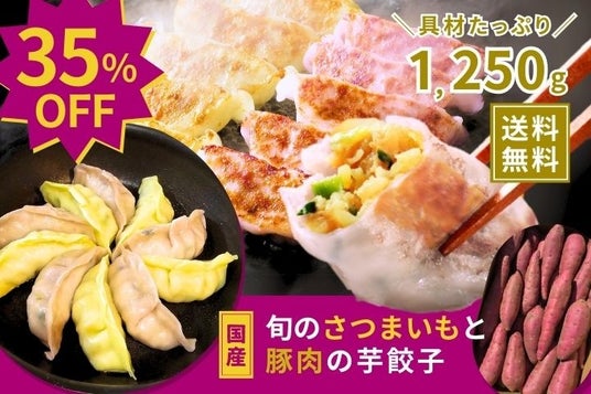 今年の「いい肉の日」はお肉だけじゃない! 芋國屋の大人気商品『お芋餃子』が35%OFFの特別価格で登場! パリっと焼き上げた皮の中から、ホクホク甘いお芋とジューシーな具材が広がる幸せなひと口をお楽しみください。
