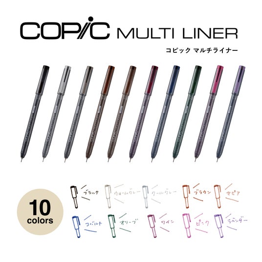 0.03mmという極細から1.0mmまで、多様な線幅と全10色のラインナップを取り揃えており、イラスト以外にも使いやすく人気のマルチライナーをぜひ体験ください。