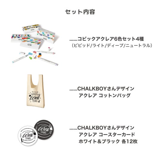 新製品の水性マーカー「コピック アクレア」全24色をセットにした限定商品を発売します。人気イラストレーターのCHALKBOYさんのデザインがプリントされたコットンバッグとコースターカード6枚パックが付いており、文具女子博限定のお得なセットとなっております。