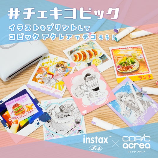 ブースでプリントしたinstax(TM)"チェキ"(※)にコピック アクレアを活用した作例を紹介予定です。自身で制作したイラスト画像をチェキプリント(TM)し、コピック アクレアを使ってイラストやメッセージなどを描きこむ「#チェキコピック」の提案を行います。フィルムにもきれいに色がのるコピック アクレアとチェキ(TM)の相性をぜひお試しください。