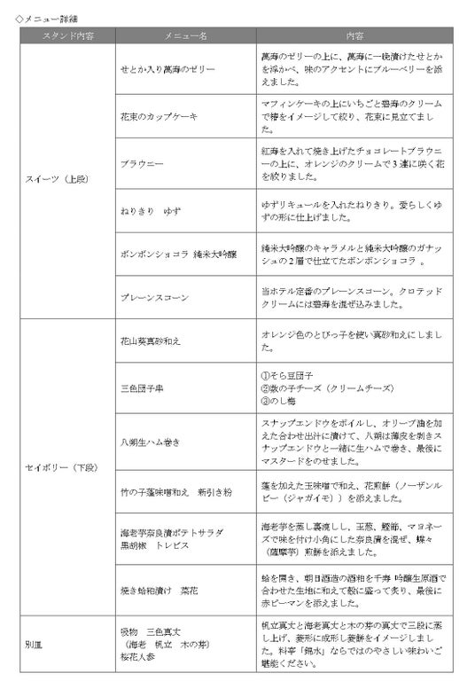 ・KUBOTAアフタヌーンティー(場所:料亭「錦水」、チェックイン日13:00~)