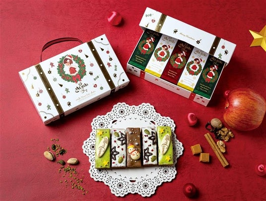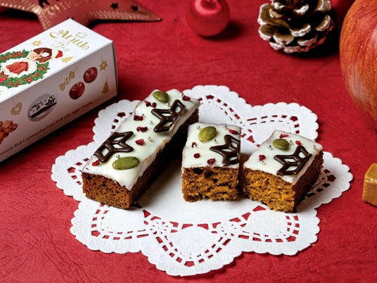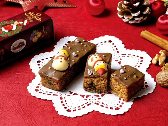 チェリー・レーズン・クルミのごろっと食感に、シナモンなどのスパイスをアクセントに加えました。クリスマスらしい雪だるまのチョコを飾りつけました。