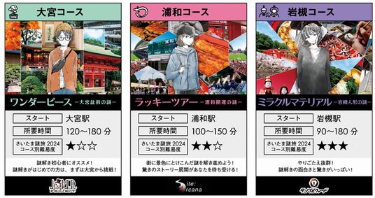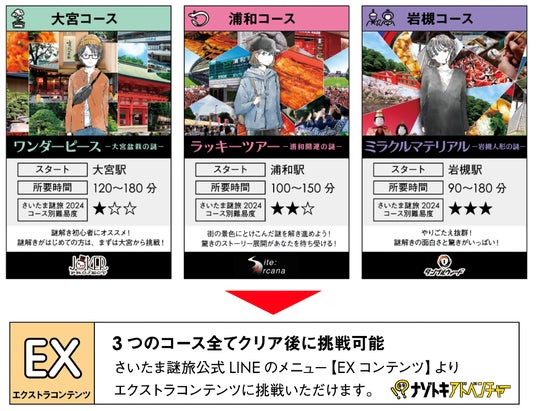 さいたまスーパーアリーナで超大型謎解きイベントを手掛ける、ナゾトキアドベンチャー制作・TAMAARI SUPER QUEST制作協力のもと、個性豊かな謎解き制作団体とのコラボレーションによる、かつてない観光周遊型謎解きイベントが完成しました!コース詳細は以下のとおりです。また、コースクリア数に応じて、LINEに送信される応募フォームからさいたま市ゆかりの景品等が当たる抽選にご応募いただけます。