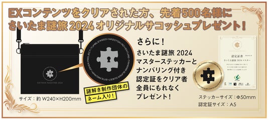 大宮・浦和・岩槻の3コース全てをクリアした方だけがチャレンジできる、「エクストラコンテンツ」を特別にご用意しました!クリアした方、先着500名様に「さいたま謎旅2024オリジナルサコッシュ」をプレゼントします。さらに!さいたま謎旅2024をコンプリートした証として、「さいたま謎旅2024マスターステッカー」と、ナンバリングされた「さいたま謎旅マスター認定証」をもれなくプレゼントします!