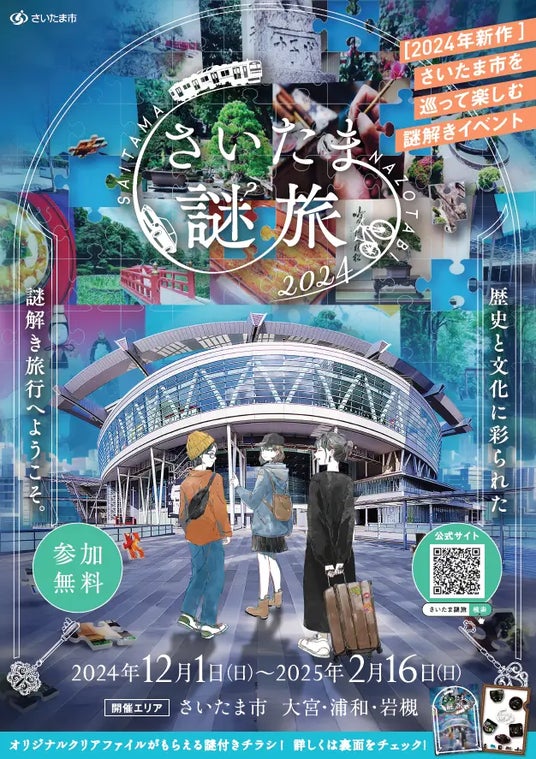 12月1日(日)から、さいたま市を巡って謎を解き、観光を楽しむ観光周遊型謎解きイベント「さいたま謎旅2024」本編がいよいよスタートします!3年目となる本イベントは、さいたまスーパーアリーナで超大型謎解きイベントを手掛ける、ナゾトキアドベンチャー制作・TAMAARI SUPER QUEST制作協力のもと、個性豊かな謎解き制作団体とのコラボレーションによってかつてない観光周遊型謎解きイベントが完成しました!内容が一新された完全新作となっています。
