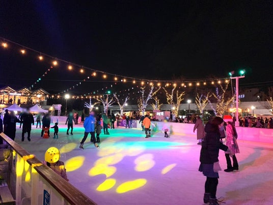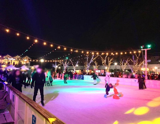 夜はライトアップに照らされ、スケートリンク全体が幻想的な雰囲気に。夜空を眺めながらアイススケートを楽しめる開放感抜群のスケートリンクです。
